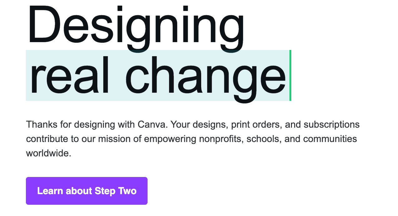 When you sign up for Canva, you’re included in their mission right away. You’ll receive an email titled “You’re a force for good” that invites you to learn about Step Two: Do the most good we can.